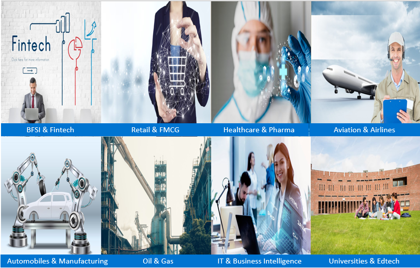Our expertise spans BFSI & Fintech, Retail & FMCG, Healthcare & Pharma, Aviation & Airlines, Automobiles & Manufacturing, Oil & Gas, IT & Business Intelligence, and Universities & Edtech.